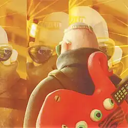 The video for "Do or Die" features Super Furry Animals playing along to the track in a room in a cartoon house. Brightly coloured animations of the group's bodies and surroundings are mixed with live action footage of their heads and instruments. This screenshot shows, from left to right, singer Gruff Rhys, drummer Dafydd Ieuan and guitarist Huw Bunford.