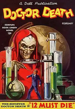 In 1932 Dell Magazines started a new pulp, titled All Detective Magazine.[1] The August 1934 issue featured "Dr. Death", a story about an archcriminal named Doctor Death; the hero is an insurance investigator named Nibs Holloway.[1][2] The author was given as Edward P. Norris, which was probably a pseudonym.[1][2] Three more stories featuring Doctor Death appeared in All Detective, ending with "Thirteen Pearls" in the January 1935 issue, in which the character was killed.[2][1] All Detective changed its name to Doctor Death the following month;[1] the lead story in the first issue of the retitled magazine, dated February 1935, was 12 Must Die,[3] with the author listed as "Zorro" (a pseudonym for Harold Ward).[2] As with the All Detective stories, 12 Must Die featured an archvillain, but his name was now Rance Mandarin.[2] It is unclear whether Dell intended there to be continuity between the two versions of Dr. Death: Robert Weinberg, a historian of science fiction, comments that Rance Mandarin is "an entirely different" character from the earlier villain,[2] but Michael Cook, a historian of detective magazines, argues that since the first issue of Dr. Death followed directly after the last issue of All Detective, "the connection is likely but not confirmed".[1]