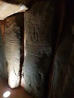 On the surface it resembles a circle-like mound with a diameter of 75 metres (246 ft).[5] It has a V-shaped passage 20.9 metres (69 ft) long[5] starting at the 0.8 metres (2 ft 7 in) wide,1.55 metres (5 ft 1 in) high western entrance, which expands to 3.1 metres (10 ft) wide and 3.9 metres (13 ft) high in the east.[1] In the eastern end of the passage there is a chamber. During the equinox, the first sun lights the interior of the passage and the chamber for some minutes, and it is assumed this was to denote an eventual re-birth of the buried.[2] Several of the standing-stones have engravings, and it is viewed as one of the largest dolmens in Spain.[4] The passage has 31 standing-stones in the northern part of the passage and 33 in the southern part.[1] The standing stones are of quartzite, sandstone, and limestone and carry 20 capstones that make the roof of the passage.[1]
