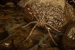 D. dondalei is nocturnal, most active two hours after dusk, and hiding under stones and logs in the daytime. It hunts at the edge of the water at night, placing its legs on the water surface, or anchoring itself to the shore with its back legs with the rest of the body floating, and feeling for vibrations with long sensory hairs on its legs.[3] It then ventures out on the water surface, resting on the surface tension, and can use a silk dragline to stop itself overshooting the target.[4][3] This lets it catch insects and even small fish—the only one of New Zealand's Dolomedes species able to do this in laboratory experiments.[5] To escape predators it dives underwater and hides between stones: it can survive underwater for half an hour, using air trapped on the hairy surface of its body.[4][3]