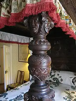 There were several kinds of beds. A richly carved bed at Crathes Castle with Burnett family monograms is one of the few surviving 16th-century Scottish beds, attributed to an Aberdeen school of carving. There is also a set of two chairs at Crathes, for the laird Alexander Burnet and one for his wife Katherine Gordon, hers with Gordon heraldry and dated 1597.[24] In April 1581 James VI had a "stand bed" made of walnut timber and painted, with an oak dining table. These stand beds were free-standing wooden structures with posts.[25]