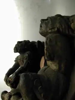 The main researcher of the La Guardia convent, Soledad Lázaro Damas, pointed out[15] that the cloister fountain occupied its original place from 1577, the year it was dated, until 1954, when it was donated by its then owners to the Instituto de Estudios Giennenses (Institute of Jaén Studies), on condition that it be placed in the courtyard of the Provincial Museum. Because of abandonment the head of the statue of Mary Magdalen on the fountain had been looted. The fountain was not moved until the following year, 1955, although it was later forgotten in the gardens of the Museum while it was occupied by the troops of the garrison. Six years later, when the archaeological museum of the Instituto de Estudios Giennenses was created in the lower galleries of the Provincial Palace, the fountain was moved to its current location. Since it was necessary to carve a new head for the main sculpture, the architect Manuel Millán was commissioned to do so.