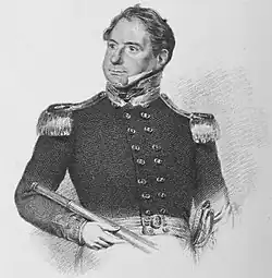 Donat Henchy O'Brien was born in March 1785 in Ireland. He was the second son of Michael O'Brien of Ennistymon, County Clare, a Royal Navy captain who claimed descent from an ancient Irish king and Hannah Henchy of Feenagh, County Clare.[1][2] O'Brien joined the Royal Navy as an ordinary seaman on 16 December 1796, and served as a midshipman.[3] He served on the Home Station on the 64-gun ship-of-the-line Overyssel (a vessel captured from the Dutch) under the command of Captain John Bazely, and later Captain John Young.[3][1] O'Brien, despite his lack of experience, was placed in command of one of the ship's boats.[1] During the 1799 Anglo-Russian invasion of Holland he commanded a flat-bottomed boat carrying troops ashore.[3] He afterwards was given command of a hoy which, heavily ballasted with stone, was intended to sink at the entrance of the harbour in Goeree (Goeree-Overflakkee) to block in three Dutch ships-of-the-line.[1] A sudden squall caused the hoy to sink and O'Brien and his crew were rescued, after some difficulty, by a boat from the hired armed cutter Lion.[3]