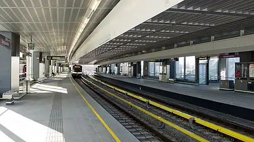 Donaumarina station, opened on 2 October 2010, is the first station on the newly extended section of the U2 line between Stadion and Aspernstraße. Located on the right bank of the Danube, the station sits above the Handelskai and is the final U2 stop on the west side of the river.[2] From there, the line crosses the Danube via the Donaustadtbrücke, a bridge used exclusively by the U-Bahn.[3] The station is named after the nearby Marina Wien boat harbor and features two tracks, each served by a side platform.[4] One exit leads to the Danube riverbank, while the second access leads to Wehlistraße, where the headquarters of the Austrian Trade Union Federation is located.[5]
