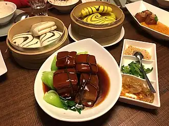 Dongpo pork (simplified Chinese: 东坡肉; traditional Chinese: 東坡肉; pinyin: dōngpōròu), also known as Dongpo meat,[1] is a Hangzhou dish[2] made by pan-frying and then red-cooking pork belly.[3] The pork is typically cut into thick, approximately 5 centimeter (2.0 inch) squares, with an even distribution of fat and lean meat, whilst retaining the skin. The texture is tender and juicy without being excessively greasy, accompanied by a fragrant aroma of wine. The dish is named in honor of Su Dongpo (Su Shi), a distinguished Song Dynasty poet and gastronome.[4]