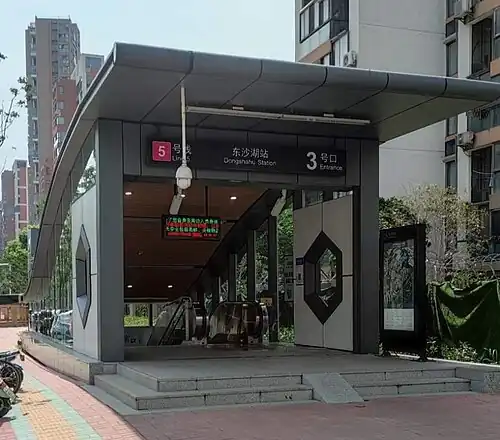 Dongshahu Station (Chinese: 东沙湖) is a station on Line 5 of the Suzhou Metro.[1] The station is located in Suzhou Industrial Park, Jiangsu. It has been in use since June 29, 2021, when Line 5 first opened to the public.[2]
