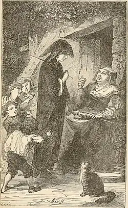 "Donkeyskin" (French: Peau d'Âne) is a French literary fairytale written in verse by Charles Perrault. It was first published in 1695 in a small volume and republished in 1697 in Perrault's Histoires ou contes du temps passé.[1] Andrew Lang included it, somewhat euphemized, in The Grey Fairy Book.[2][3] It is classed among folktales of Aarne-Thompson type 510B, unnatural love.