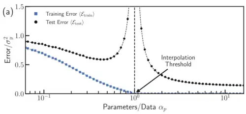 An example of the double descent phenomenon in a two-layer neural network: as the ratio of parameters to data points increases, the test error first falls, then rises, then falls again.[1] The vertical line marks the "interpolation threshold" boundary between the underparametrized region (more data points than parameters) and the overparameterized region (more parameters than data points).