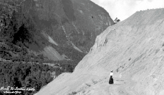 The next land portion of the route, known as the Long Portage or the Pemberton Portage, follows the lower Birkenhead River then diverges from it to Birken Lake (a.k.a. Summit Lake or Gates Lake) and then via the Gates River to present-day D'Arcy at the head of Anderson Lake, then known as Port Anderson. From there a motley variety of watercraft, including the "Lady of The Lake", a small steamer and the ubiquitous native canoe, ferried travellers to the Short Portage (today known as Seton Portage).[2] There packers and ultimately a short mule-drawn "railway" shuttled men and freight to the head of Seton Lake, where another collection of steamers carried them to the foot of that lake and a final five-mile wagon road to the boomtowns of Cayoosh Flat, Parsonville and Marysville (today's Lillooet).