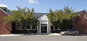 Douglass High School is a one-story brick building, originally of 9,400 square feet (870 m2). The plan is centered on a commons area that functioned as a gymnasium, cafeteria and auditorium, flanked by two classrooms on either side. Large windows light and ventilate the spaces. A large stage area is directly opposite the main entrance, which opens directly into the commons area from a vestibule. Classrooms were added on the rear of the building, followed by a gymnasium in 1960. A vocational wing lies to the west.[3]