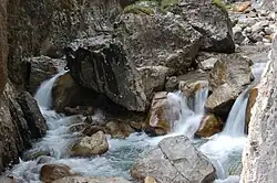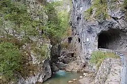 The Dovžan Gorge (Slovene: Dovžanova soteska[1] or Dolžanova soteska[2]) is a gorge in Slovenia that was carved by the Tržič Bistrica River. The river flows through unique waterfalls over large rounded blocks of white quartz conglomerate. These large blocks tumbled into the river from Pine Cliff (Slovene: Borova peč) above the right bank, named after the Scots pine that overgrows its steep slopes.[3]
