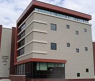 Columbus Downtown High School is a public high school and vocational school located in Downtown Columbus, Ohio. It is a part of Columbus City Schools. It was built to consolidate, along with the existing Fort Hayes Career Center, three closing career centers (Northeast Career Center, Northwest Career Center, & Southeast Career Center) in the Columbus City Schools district. While a career center, it also functions as a high school with a capacity of 800 students.