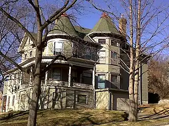 The Matthey house is located a block away from Hilda's parents and even closer to her three brothers. It architecturally embraces a transitional style that combines the Georgian and Colonial Revival styles with elements of the Queen Anne style.[4] The Georgian Revival features include the rectangular form, a high hipped roof, a Palladian window in the dormer, a symmetrical front with the entrance on the right and a columned porch.[5] On the east side of house is a projecting window bay and a tower on the southeast corner of the house that are reminiscent of the Queen Anne style.[5]