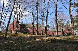 The Bigelow House is located high on Oak Hill, from which the Newton neighborhood takes its name. It is a large 2+12-story wood-frame structure, with a rambling structure organized roughly around a central courtyard. It is in the Shingle style, with a combination of roof types. A small turret with conical roof projects from the building's southwest corner. The main section of the house is on the east side of the courtyard, with the southern wing primarily servants' quarters and facilities, and the carriage house to the north.[3]