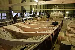 Copies of Viking ships are usually based on interpretations of archaeological material, but in the construction of Draken Harald Hårfagre an alternative method was used. It was decided to begin with the living tradition of Norwegian boatbuilding, with roots that can be traced directly to the Viking Age.[4][5] The foremost Norwegian traditional boat builders are involved in the project.[6] Their knowledge of traditional boatbuilding is supplemented with the results of investigations carried out on archaeological material, source material in Old Norse literature, literature from the same period from foreign sources, iconographic material, etc. The goal of the project is to recreate in this manner an oceangoing warship of 50 oars taken right out of the Norse sagas.
