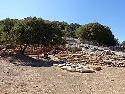 Thirteen stones inscribed with archaic letters were discovered in a Hellenistic cistern in Dreros.[1] These stones apparently came from the east wall of the temple of Apollo Delphinios, and make up eight inscriptions or fragments of inscriptions.[2] This display of laws in public, often in sanctuaries, is a frequent feature of archaic Cretan law.[3] The Dreros inscription is the longest of these eight laws.[4]