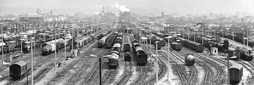 At about the same time as the closure of the Berliner Bahnhof, the Dresden-Friedrichstadt marshalling yard was completed immediately south of it and it went into service on 1 May 1894.[8] Designed as a one-sided gravity yard, all tracks, apart from the entry and exit groups, lay on a slope of 1:100. Because of its situation in the middle of the flat Elbe valley, a hump was built from the spring of 1891. In order to provide material for it—a total of 1,55 million cubic metres was needed—the neighbouring basin of the river port of Alberthafen and the trough in the Ostragehege were excavated at the same time. The highest point of the yard, which was kilometre-long, was located at the northwest end and was 17.73 metres above the level of the lowest point under the Waltherstrasse bridge. Shunting engines pulled wagons up the five-track runoff hump, which each wagon would roll off and be directed by points towards a destination track.[8]