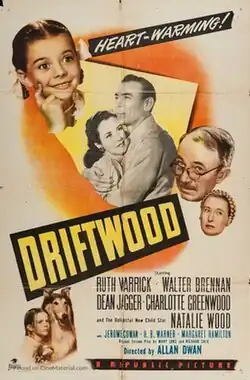 Driftwood is a 1947 American drama film produced and directed by Allan Dwan and starring Ruth Warrick, Walter Brennan, Dean Jagger and Charlotte Greenwood. The movie also features Natalie Wood as a little orphan girl who adopts a collie. It was produced by Republic Pictures, the largest Hollywood company outside the major studios, as a more prestigious release than the low-budget westerns and crime films that Republic specialized in.