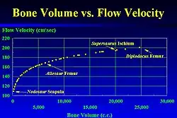 Graph showing the relationship of dinosaur bone volume to Dry Mesa fluvial channel flow velocity