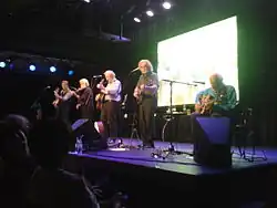 The Dubliners 50th Anniversary Tour was a tour in 2012 by the Dubliners celebrating 50 years. The group was awarded a lifetime achievement award by BBC Radio 2 in February.[1] However, in April, founding member and tenor banjo player Barney McKenna died.[2] Banjo player Gerry O'Connor filled his place until the end of the tour. In November the group released the album 50 Years charting in the Irish Top 10.[3] John Sheahan after 48 years decided he could no longer continue with the band due to the death of Barney McKenna. In December the group played its final concerts at Vicar Street and were joined on stage by Jim McCann. The band met with President Michael Higgins in the presidential palace in Dublin. The group appeared on BBC's Jools Holland Annual Hootenanny on New Year's Eve. With the exception of John Sheahan, the rest of the group continues touring as The Dublin Legends – Spirit of the Dubliners.