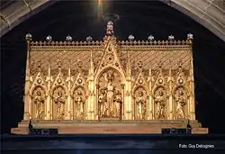 On the morning of Trinity Sunday, the shrine is placed on the Car d'Or ("Golden Chariot"), which is a gilded dray, and the procession begins. The Car d’Or is pulled through the streets by draft horses. The carriage is accompanied by several guilds that represent the history of the region. At the end of the procession, the Car d’Or has to climb a steep, cobblestone street, the Rampe Sainte-Waudru. To help the horses with the immense weight, hundreds of people gather behind to push. Local superstition holds that if the Car d'Or does not reach the top of the hill in one go, the city will suffer great misfortune. This happened in 1803, due to the French Revolution, as well as in 1914 and in 1940, just prior to the two world wars.