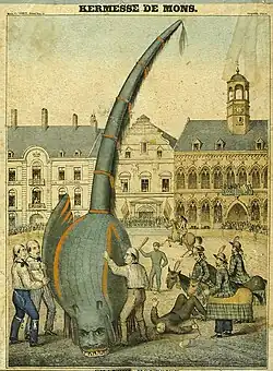 The Ducasse de Mons, also commonly known as the Doudou, is a traditional folk festival held in Mons, Hainaut, Belgium, on Trinity Sunday (57 days after Easter). The feast comprises two important parts: the procession, including taking Saint Waltrude's shrine down from its altar and placing it on a dray, as well as the combat named Lumeçon between Saint George and a dragon. Since 2008, it is recognised as a Masterpiece of the Oral and Intangible Heritage of Humanity by UNESCO.[1]