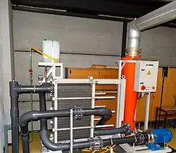 Large RF dummy load for shortwave transmitter at the Moosbrunn transmitting station of the Austrian Broadcasting Service, Moosbrunn, Austria. It uses a sodium hydroxide solution to absorb the radio energy, which is circulated through the radiator (center) to cool it. It has a capacity of 100 kW.