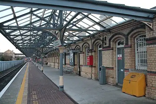 In 1875, the Dublin & Belfast Junction Railway merged with the Dublin & Drogheda Railway,[3] and the following year, it combined with the Irish North Western Railway and the Ulster Railway to form the Great Northern Railway (Ireland) (GNR). The current Dundalk Clarke station was built in June 1894 and designed by William Hamilton Mills, featuring his signature polychromatic brick style, predominantly in yellow, which is also found in stations like Lisburn, Malahide, and Howth.[4][5][6][7]