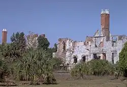 Dungeness on Cumberland Island, Georgia, is a ruined mansion that is part of a historic district that was the home of several families significant in American history. The mansion was named after a nearby sandy spit at the southern end of the island, first recorded in a land grant petition in 1765 and almost certainly named after the Dungeness headland, on the south coast of England.[2]: 54  The first Dungeness house was the legacy of Revolutionary War hero Nathanael Greene, who had acquired 11,000 acres (45 km2) of island land in 1783 in exchange for a bad debt. In 1800, his widow Catharine Miller (by then remarried) built a four-story tabby mansion over a Timucuan shell mound.[2]: 98–101  During the War of 1812 the island was occupied by the British, who used the house as a headquarters.