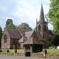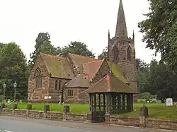 It is a stone building in 14th century style and consists of nave, chancel, transepts, vestry, and a spired west tower. In 1887, a new churchyard, given by the family of a former parishioner, was consecrated, previous burials having been carried out at Penkridge. In 1907, the vestry was added and a new organ installed. The church contains memorial tablets to Thomas Perry (d. 1861), in whose memory the church was built, to his widow Mary (d. 1881), and to later members of the Perry family who lived at nearby Dunston Hall. There are memorial windows and a tablet to members of the Hand family including Charles Frederic Hand (d. 1900), also tablets to John Taylor Duce (d. 1886), Albert Pickstock (d. 1926), and three members of the Thorneycroft family (d. 1913, 1924, and 1943). The two bells of the ancient chapel in 1553, were replaced by one bell in the new church by 1889. This arrangement was then replaced in 1890 by a carillon of eight tubular bells, rung from a keyboard, donated by Mrs. Perry of Dunston Hall.[12]