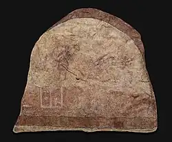 Graffiti and drawings were found on the walls of the house. A Greek inscription on the west wall of the assembly hall is important for the history of the building. It names the year 545 of the Seleucid era, which corresponds to the year 232/233 AD.[60] Several examples of the Greek alphabet were present, as was one instance of the Syriac alphabet.[61] Four names were also identified, two of which, Paulus and Proclus, come from Latin and are linked to members of the Roman garrison who occupied the city, lending to the theory that the Roman army had an influence on the origin of Christianity in Dura-Europos.[30] Also noteworthy are two line drawings, each depicting a rider.