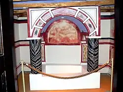 In the house's north wing, room 5, which was approximately 7.5 m × 4.2 m (25 ft × 14 ft) and together with room 6 at the north-west corner, formed the private quarters of the house—perhaps the gynaeceum. A window was pierced in the south-eastern wall, and the doorway leading to room 6 to the north had a careful decoration that was unusual for an interior door. Room 6 was about 6.8 m × 3.15 m (22.3 ft × 10.3 ft); this was converted into a baptistry. In its original state, it was a service room. It was first divided in the direction of the height by installing a ceiling at 3.45 m (11.3 ft) off the ground. The western part was dug up to the bedrock for the installation of a basin against the western wall.[17] The basin was 1.63 m (5.3 ft) wide and 0.95 m (3.1 ft) deep, including 0.5 m (1.6 ft) above the ground level of the room. It was topped with brick-and-mortar masonry ciborium consisting of a barrel vault 174 m (571 ft) wide, which was supported by two pilasters along the west wall and two masonry columns on the east side. A 0.2 m (0.66 ft) step was built in front of basin.[18] The whole constitutes the baptismal pool of a building of worship. On the other side of the room, a low bench 0.22 m × 0.5 m (0.72 ft × 1.64 ft) was built along the wall. A semicircular niche is dug in the south wall between the two doors, and a table was set up in front of it. All of the room's the walls received a rich, painted decoration; geometric and plant motifs were painted on the baptismal pool; the room's ceiling and the vault were decorated with white stars on a blue background, according to a pattern quite similar to that of the vault of the mithraeum of Dura Europos. The decoration of the ciborium also recalls that of the Torah niche in the synagogue; the same artists were probably responsible for both.[18]