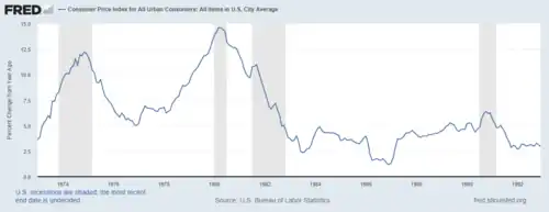 The United States entered recession in January 1980 and returned to growth six months later in July 1980.[1] Although recovery took hold, the unemployment rate remained unchanged through the start of a second recession in July 1981.[2] The downturn ended 16 months later, in November 1982.[1] The economy entered a strong recovery and experienced a lengthy expansion through 1990.[3]