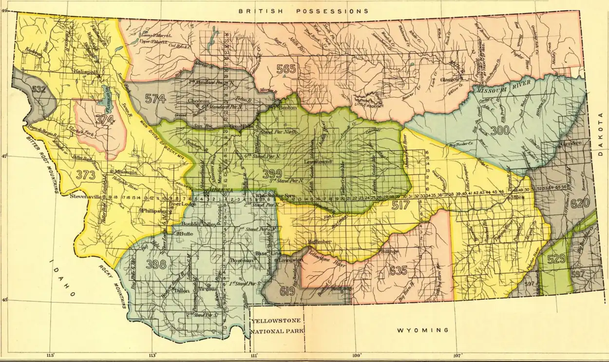 A number of different Native Americans living in present-day Montana entered into treaties with the United States during the 19th Century. Most of the treaties included an article that established the territory of the tribe (or tribes) entering into it. More and more of this Indian land turned into public or U.S. territory with the signing of new treaties. (See the maps).