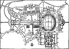 The central area of the campus is formed by the intersection of two north–south axes and two east–west axes to form two large groups of buildings. The overall planning is based on the terrain of the mountain. The central area of the campus is planned in the area surrounded by mountains on the east, south and north sides, and the west side is a low-lying area. The low-lying area is used as a sports field, and the stands are built along the slope. The building complex is arranged on the upper side of the concave school front road outside the stands. The School of Engineering is built on the south mountain (Huoshi Mountain), the School of Science is built on the north mountain (Xiaogui Mountain), and the auditorium is planned on the ridge on the east side. A group of buildings is formed with the sports field as the center and the auditorium as the main body. The School of Engineering and the School of Science are located at the north and south ends of the 400-meter center line of the sports field, respectively, and are the left and right wings of the auditorium. The auditorium and the gymnasium are upright on the east–west axis of the sports field. The sports field is west of the mountain (500 meters long from east to west and more than 200 meters wide from north to south). The terrain drops sharply, which is the sunken central garden of the campus. The gymnasium is below it. Thus, a north–south axis running through the School of Engineering and the School of Science, and an east–west axis extending from the auditorium to the gymnasium to the west of the stadium are formed. The space echoes, the terrain is staggered, the composition is well-organized, yet very vivid and in line with the terrain. The Lion Mountain on the northwest side of the central area overlooks the East Lake from the east and north, and the outline of the top of the Lion Mountain can also be seen from the East Lake, forming another group of buildings with the library as the main body. The Lion Mountain in the hilly area of Beishan sits south and faces north. The library is prominent in the center of the top of the mountain; the east and west wings are the School of Arts and the School of Law, standing opposite each other; the student dormitory on the south is built on the slope. The flying eaves and green tiles are hidden in the green trees, making the mountain look more lush and staggered. The overall unity of the construction of Wuhan University's campus has the characteristics of group and single buildings. There is plenty of sunshine in winter and the south wind blows in summer, which complements and adds to the beautiful scenery of lakes and mountains.[17]