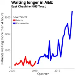 Four-hour target in the emergency department quarterly figures from NHS England Data from https://www.england.nhs.uk/statistics/statistical-work-areas/ae-waiting-times-and-activity/