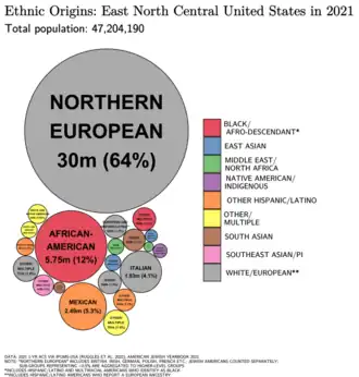 In 2010, the East North Central states had a population of 46,421,564; this grew to an estimated 46,902,431 by 2019.[8] By the 2020 United States census, the region's population increased to 47,368,533. Of its population, Illinois is the region's most populous with a 2020 population of 12,812,508.[9] Its least populous is Wisconsin, with 5,893,718 residents.[10] Chicago is the region's most populous city and largest metropolitan area. According to the 2010 American Community Survey, 49.1% of the residents were male and 50.9% were female. Approximately 24.0% of the population were under 18 years of age, and 13.4% were over 65 years of age, and the median age for the region was 39.2.