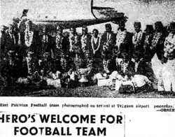 The team participated in the National Football Championship from 1948 to 1960, becoming champions in their final year, after which the EPSF began sending divisional teams to the tournament.[1][2] East Pakistan won their maiden international trophy in 1970, the King Mahendra Cup in Kathmandu, Nepal, during which they also played their final competitive games, as the team was dissolved during the Bangladesh Liberation War.[3][4][5] Apart from East Pakistanis, the team often included players from West Pakistan, who, at the time, participated in the Dhaka First Division League. This contributed significantly to their success.[6]
