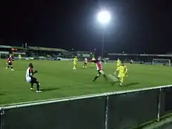 The next season they finished in the bottom half of the table in 17th place and in the 2006–07 season they just missed out in the play-offs finishing in 7th place.[15] The 2007–08 season was one of Eastbourne Borough's most memorable. From the start of the season until 1 January 2008 they were unbeaten at the top of the league, until losing to local rivals Lewes in front of 3,027 fans at Priory Lane.[16] At the end of the season Eastbourne finished 2nd with 80 points while Lewes won with 89 points.