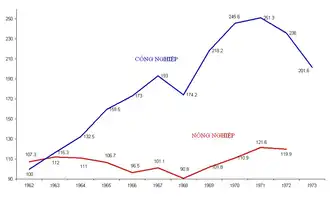 South Vietnam's industry suffered from the departure of foreign troops in the early 1970s, which resulted in significantly less demand. Industrial output shrank by 5% in 1972 and by over 20% in 1973 and 1974.[9] By 1973 food processing was by far the largest industry in terms of output (almost half of the total industrial output of 448 billion dong), followed by textiles (around 1/5 of total output, but the largest employer with 32,489 out of 111,964 workers) and chemicals (1/10) (in terms of capital, electricity was the largest industry).[10]