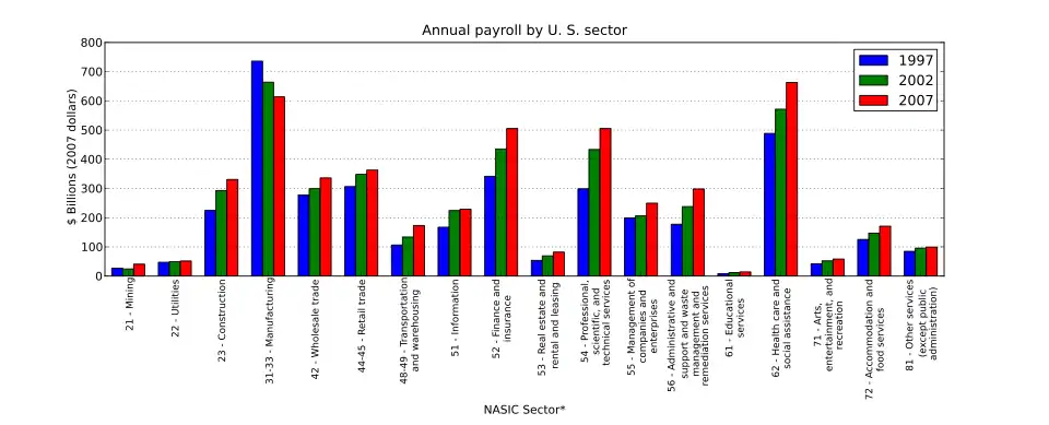 Annual payroll by sector in the United States economy in 1997, 2002, and 2007.