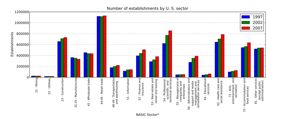 Number of establishments by sector in the United States economy in 1997, 2002, and 2007.