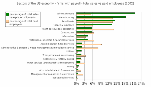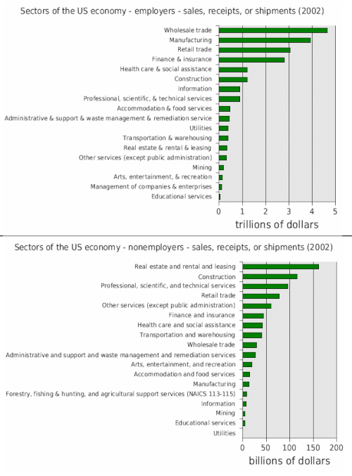 Sectors of the US economy ranked by number of sales, receipts, or shipments in the year 2002. Includes both employers and nonemployers