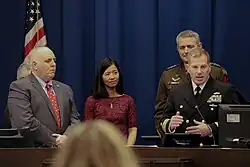 Flynn and Mayor Wu listen as U.S. Army Lt. Gen. Jonathan Braga and U.S. Navy Capt. Henry Roenke address the Boston City Council in celebration of the 2023 Army–Navy Game being held in the Boston-area