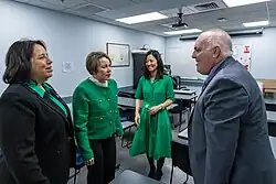 Flynn (right) speaks with Lieutenant Governor Kim Driscoll, Governor Maura Healey, and Mayor Wu at the 2024 South Boston St. Patrick's Day Breakfast