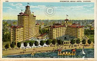 The Edgewater Beach Hotel was a resort hotel complex on Lake Michigan in the far-north neighborhood community of Edgewater in Chicago, Illinois, designed by Benjamin H. Marshall[5] and Charles E. Fox. The first multi-story hotel building was built in 1916, for its owners John Tobin Connery and James Patrick Connery, located between Sheridan Road and Lake Michigan at Berwyn Avenue in a Spanish Revival style. An adjacent south tower building was added in 1924, with a low connecting passageway-building to serve as reception and additional public rooms.[6] The resort, which included beaches, pools, clubs, and gardens hosted famous movie and sports stars, and later Martin Luther King Jr.[7] The hotel was also the setting for the celebrity stalking case and shooting that inspired the novel and movie The Natural. The hotel buildings closed in 1967, and were soon after demolished.