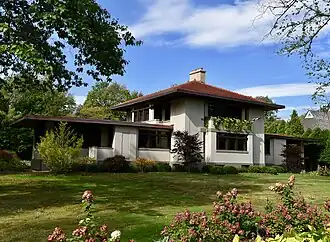 The Edmund D. Brigham House is a house designed by Frank Lloyd Wright at 790 Sheridan Road in Glencoe, Illinois. Wright designed the house circa 1908 for Edmund D. Brigham, a freight agent for the Chicago & North Western Railway, and it was completed the following year. Wright's design is a variation of the one in his article "A Fireproof House for $5000", a concrete home design which he published in the Ladies' Home Journal in 1907. While the Brigham House was the only one of Wright's Fireproof House for $5000 designs actually built with concrete, he would continue to work and experiment with the material throughout his career. The house's Prairie School plan has a central two-story section with one-story wings on either side, several rows of casement windows, and large piers at the corners of the central section and the middle of each wing.[2]