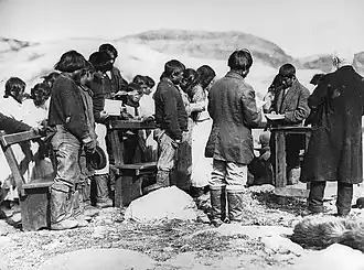 In 1894 the whaling station on Blacklead Island, in Cumberland Sound, was purchased by Mr. C. Noble and offered to Peck as an Anglican mission.[10][11] His only communication with the outside world was a ship which, specially chartered, visited him once a year, brought him letters and supplies. With his colleague, Mr. Bilby, he built his own house and cooked his own meals. The settlement consisted of a church, a hospital and two dwelling-houses. The earliest church was made of seal-skin; it had to be replaced by a wooden structure, as it was devoured by the dogs.[12]