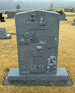 The back of the memorial contains engraved scenes from 1890s Creede, Colorado, where O'Kelley fatally shot Ford. The monument was erected through the efforts of Judith Ries, O'Kelley's great-great niece.