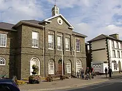 Aberaeron was founded by Rev. Alban Thomas Jones Gwynne following an Act of Parliament in 1807,[8] but it appears that town did not start to be laid out until about 1830.[9] Edward Haycock was employed by Colonel A J Gwynne[10] for supervising the building of houses and their layout in a grid plan around squares, including the principal one, Alban Square. In 1833, Samuel Lewis's “Topographical Dictionary of Wales” records “Upwards of thirty new leases have been granted, pursuant to which several houses have been already built, and others are already in progress; a general post-office, a posting-house and an excellent hotel have been established". The Town Hall (1833–35), which later became the Cardiganshire County Hall, a typical building in Haycock's style, soon followed.[11] The building of the planned town continued until the 1850s with a house in Portland Place being dated 1855. The posting house mentioned by Lewis could be the Castle and the hotel could be the Harbourmaster Hotel. Haycock achieved a consistency of style throughout the project which results in the attractive appearance of Aberaeron today.